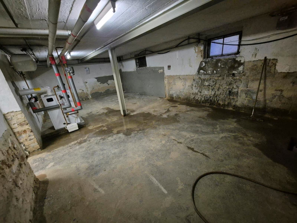 Im Heizungskeller ist ein Wassereintritt zu verzeichnen. In der Vergangenheit kam es bedingt durch den Wassereintritt zu Schäden im Keller. Mittlerweile befindet sich dort ein Pumpensumpf, um das temporär durch die Außenwände eindringende Wasser (vermutlich abhängig vom Grundwasserstand) in den angrenzenden Kanal abzupumpen.
