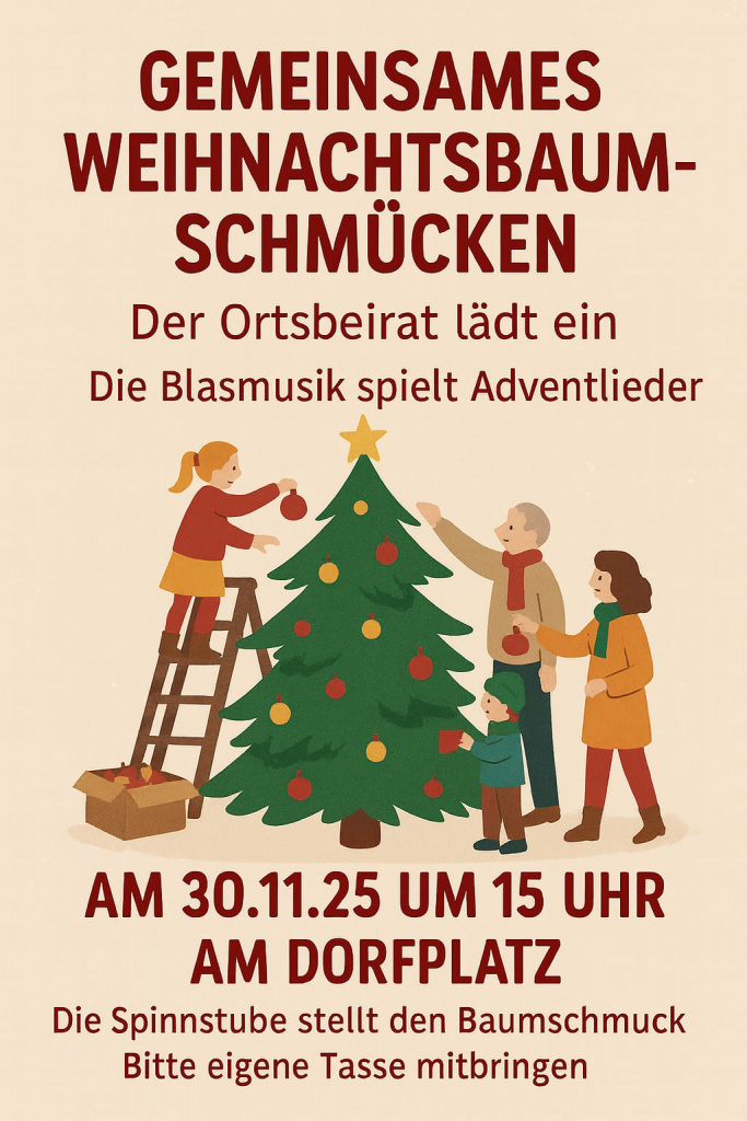Der Ortsbeirat Werdorf lädt alle Bürgerinnen und Bürger ein, am 30.11.2025 ab 15:00 Uhr gemeinsam den Weihnachtsbaum auf dem Dorfplatz Werdorf zu schmücken. Für festliche Stimmung sorgt die Blasmusik Werdorf mit besinnlichen Adventsliedern. Den Baumschmuck stellt die Spinnstube – bitte denkt daran, eure eigene Tasse mitzubringen.