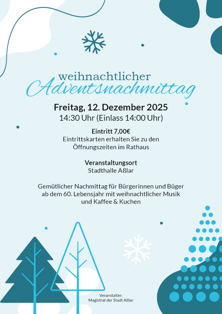 Am Freitag, den 12. Dezember 2025, beginnen wir um 14:30 Uhr (Einlass ab 14:00 Uhr) in der Stadthalle Aßlar, Mühlgrabenstraße 1, 35614 Aßlar.