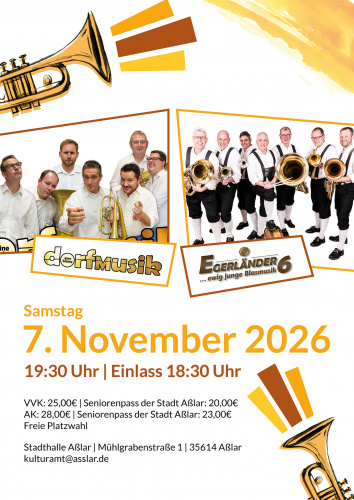 Am Samstag, den 7. November 2026, lädt die Stadthalle Aßlar zu einem besonderen Konzertabend für alle Freunde der Blasmusik ein. Auf der Bühne stehen die Ensembles „eine kleine Dorfmusik“ und die „Egerländer 6“, die beide für Tradition, Spielfreude und handgemachte Musik stehen, die direkt ins Ohr und ins Herz geht. Konzertbeginn ist um 19:30 Uhr, Einlass ab 18:30 Uhr. Veranstaltungsort ist die Stadthalle Aßlar, Mühlgrabenstraße 1, 35614 Aßlar.