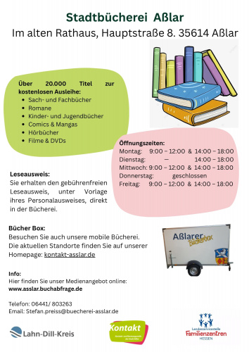Die Stadtbücherei befindet sich im Stadtkern Aßlars, im "alten Rathaus" in der Hauptstraße 8.